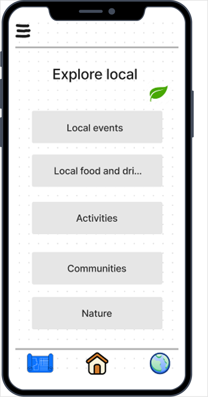 The interface encourages discovery of lower-impact travel options and authentic local experiences while maintaining a simple and intuitive navigation structure.