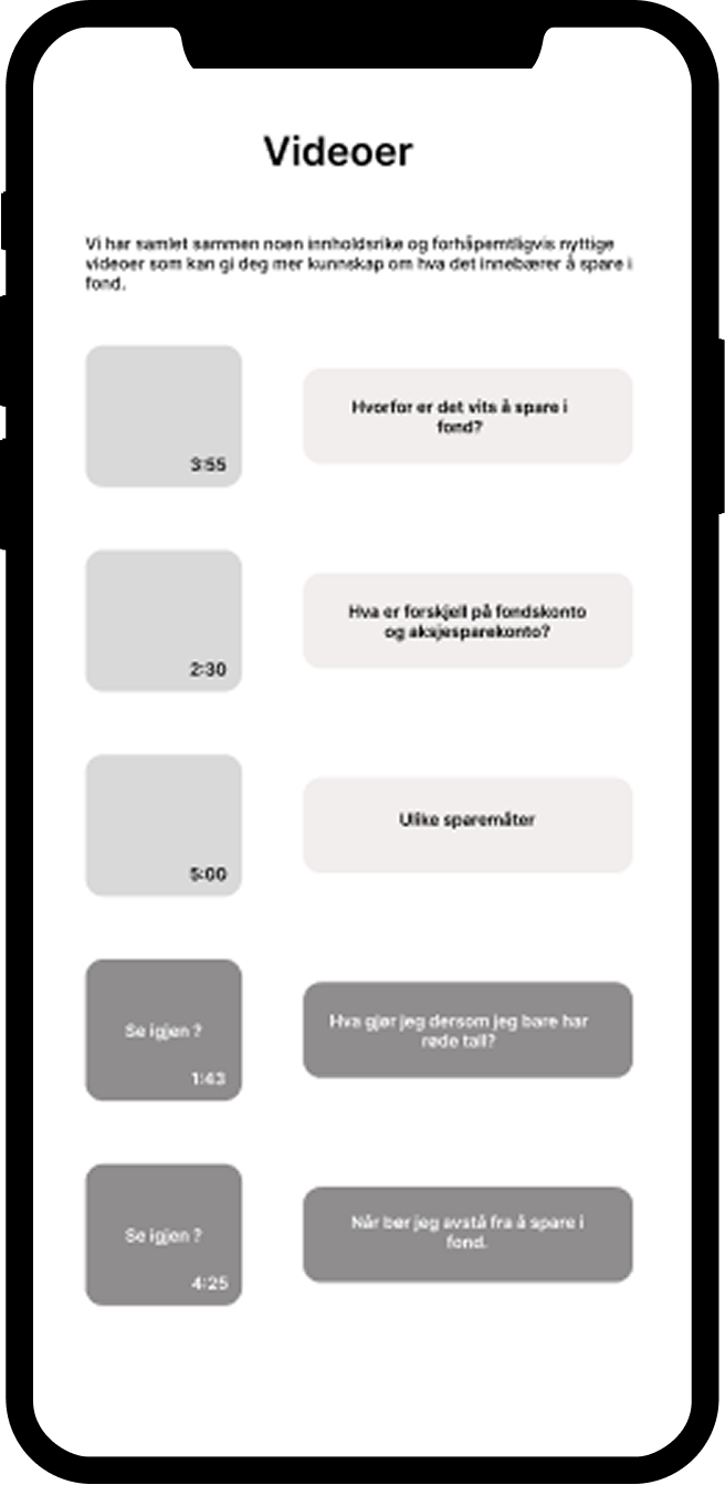This wireframe explores how educational videos and content could be structured to help users understand investing concepts in a simple and accessible way.